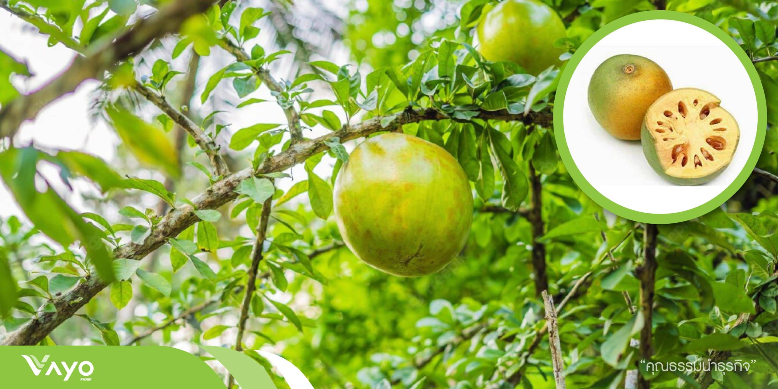 - ผลมีทรงกลมผิวเรียบ ตอนที่ยังเป็นผลอ่อนจะมีเปลือกเป็นสีเขียว และเปลี่ยนเป็นสีน้ำตาลอมเหลืองเมื่อแก่ ส่วนเปลือกจะแข็งขึ้นเรื่อยๆ ตามอายุ เนื้อในค่อนข้างนิ่ม มีสีเหลืองอมส้ม
