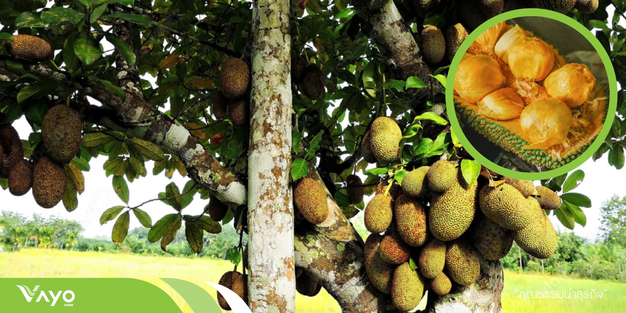 - ผลสดแบบมีเนื้อ เป็นผลรวม รูปรีหรือทรงกลมยาว กว้าง 15-20 ซม. ยาว 30-45 ซม. มีหนามเป็นตุ่มๆ ไม่แหลม สีเขียวอมเหลือง เมื่อสุกสีนํ้าตาลอมเหลืองและมีกลิ่นหอม น้ำหนักต่อผล 3-5 กก. เมล็ด มีเนื้อสีเหลืองห่อหุ้ม เนื้อบางอ่อนนุ่มและรสหวานกว่าขนุน เมล็ดหนา รูปไข่ สีน้ำตาลอ่อนขนาดใหญ่ 1 เมล็ดต่อผลย่อย