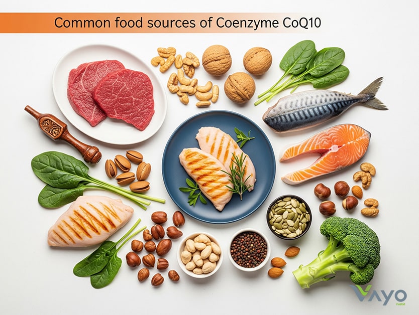 - เนื้อวัว (โดยเฉพาะสันนอก / เนื้อแดง): ประมาณ 2.6 – 3.1 มิลลิกรัม ต่อเนื้อ 100 กรัม (หรือ 3.5 ออนซ์) เนื้อวัวที่เลี้ยงด้วยหญ้าอาจมี CoQ10 สูงกว่าวัวที่เลี้ยงด้วยธัญพืช และเครื่องในสัตว์อย่างหัวใจวัวจะยิ่งมี CoQ10 สูงกว่าเนื้อแดงมาก (ประมาณ 11.3 มก./100 กรัม)