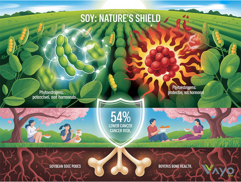 ไฟโตเอสโตรเจนในถั่วเหลืองไปจับกับตัวรับเดียวกับเอสโตรเจน แต่ไม่ก่อฤทธิ์ของฮอร์โมน จึงช่วยลดความเสี่ยงของมะเร็ง